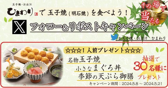 M&Sフードサービス株式会社(本社:大阪府大阪市、代表取締役社長:夏井 克典)が運営する「玉子焼・お出汁 ひまわり」では、当店の”特製お出汁”をたっぷり使用した名物玉子焼、季節で変わるお出汁の効いた炊き込みご飯、お出汁の旨味と天ぷらの相性ピッタリの天ぷらうどんが一番の人気商品の玉子焼和食チェーンです。この度、玉子焼・お出汁ひまわり公式Xアカウントをフォロー&リポストして応募すると、抽選で30名様に「名物玉子焼 小さなまぐろ丼 季節の天ぷら御膳1人前(税込み1,595円)」をお召し上がりいただけるデジタルお食事券プレゼントキャンペーンを、2024年5月8日(水)より開催します。この機会にぜひご応募ください。