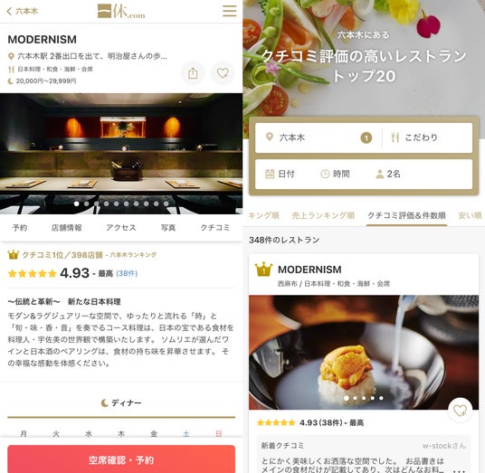 「一休.com」にて六本木エリアでの口コミ評価が高いレストラン1位を獲得