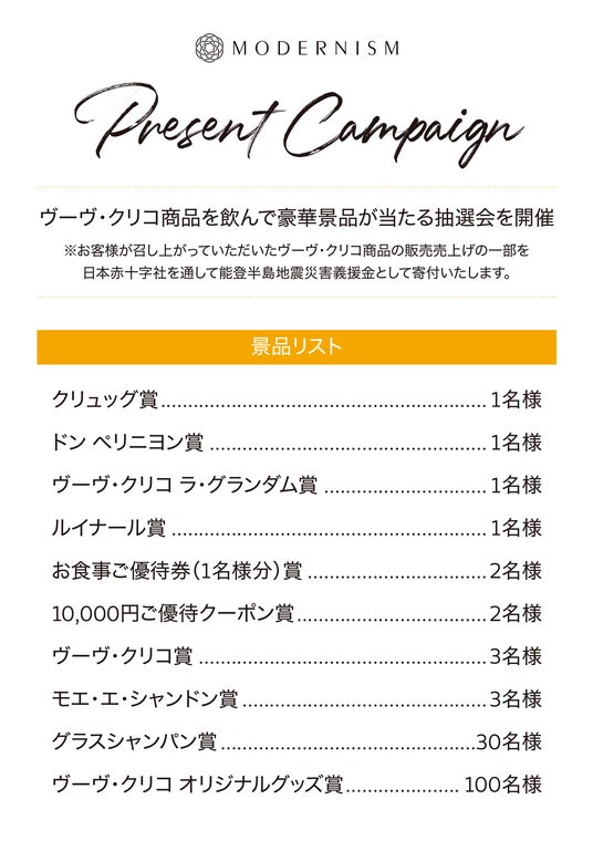 本ヴーヴ・クリココラボキャンペーンでは、その売上の一部を能登半島地震に係る災害義援金として、日本赤十字社を通し寄付いたします。
