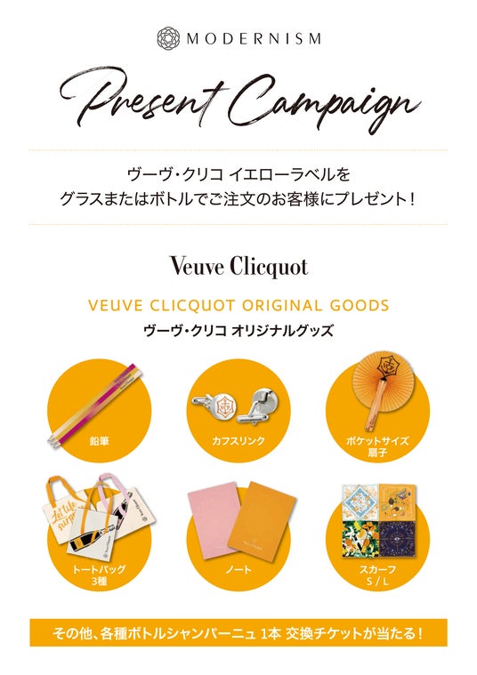 「MODERNISM」のオープンは、2023年4月。このたび、オープン1周年を迎えることを記念し、シャンパーニュブランド「ヴーヴ・クリコ」とのコラボキャンペーンを開催する運びとなりました。1772年の創業以来、2世紀以上も変わることなく大胆でスリリングなシャンパーニュであり続ける「ヴーヴ・クリコ」。常に最先端の感覚をまとい、真のラグジュアリーブランドとして人々を魅了するそのスタイルは、シャンパーニュ地方で今もラ・グランダム(偉大なる女性)と呼ばれるマダム・クリコの「品質はただひとつ、最高級だけ」という信念に導かれています。