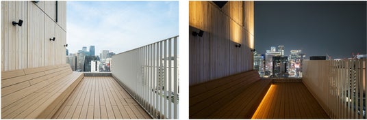 12Fから屋上へとつづく階段を上がると広がるのは、銀座の街並みを一望できるインフィニティテラス。ゆったりと腰掛けることのできるデッキベンチでの外気浴は、空と景色とが一体となる不思議な感覚を味わうことできます。