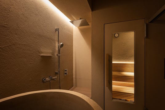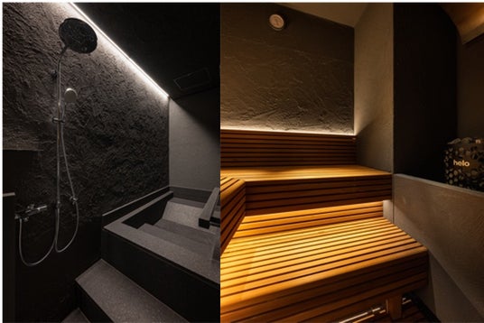 天井が高く、ゆったりとお過ごしいただけるゆとりのある空間。肩まで浸かれる贅沢な水風呂でクールダウンした後は、専用バルコニーで外気浴をお楽しみください。