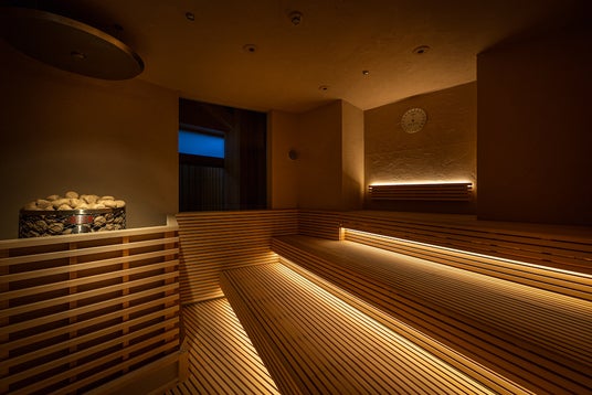 12Fは天井が高く、木材を贅沢に使用した開放的な大空間。15名ほどが収容できるサウナ室には、「iki(イキ)」のサウナストーブを設置し、20-30分毎にオートロウリュを実施。本場フィンランドで楽しまれている“ロウリュ浴”をご堪能ください。