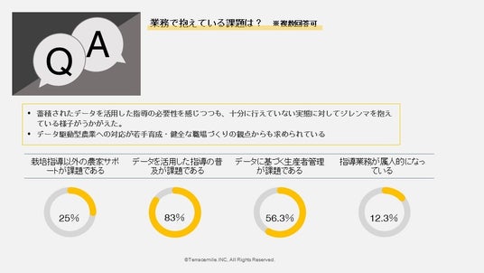 情報資産を活用して農家の利益を最大化するテラスマイル株式会社(本社:宮崎県宮崎市、代表取締役:生駒祐一)は、165の自治体とJAに向けた営農指導についてのアンケートを実施しその結果を踏まえ、自治体・JA向けにRightARM技術基盤の提供を開始します。これにより自治体やJAは、産地の現状・目標に沿った任意の粒度・形態で、農業のデータ収集からデータ利活用までを自由に構築することが可能になります。