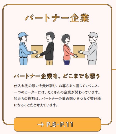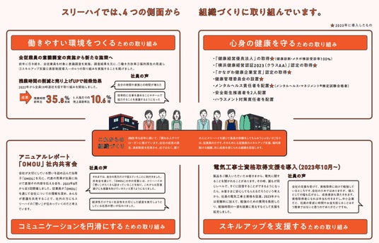 さらに、「OMOU 2023」作成にあたっては、社長と経営企画室だけでなく、スリーハイの社員が深く作成に携わりました。特にパートナー企業の皆様に向けた取り組みをまとめたページでは、パートナー企業と最も接する営業に携わる社員が担当したことにより、パートナー企業の皆様の声をより取り入れることができました。