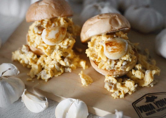 ふわふわのたまごをニンニクのソースで和え、食べやすいサイズのハンバーガーに仕上げました。たまごとニンニクの溢れる味わい…思い切りかぶりついてお楽しみください。