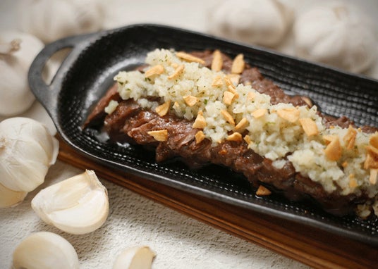 牛ハラミのステーキの上に、3種類のハーブをブレンドした生ニンニクをたっぷりのせました。お肉とガッツリニンニクの組み合わせで、ビールが無限に飲めるガーリック愛好者におすすめの洗練された逸品です。
