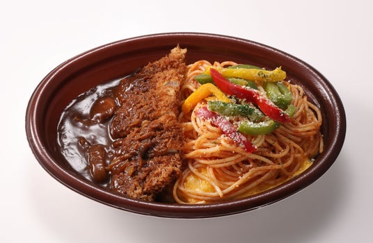 九州産の豚肉を使ったカツとパスタのせオムライス丼。