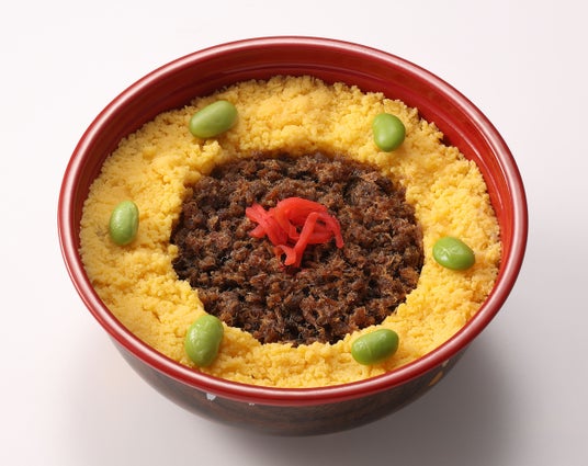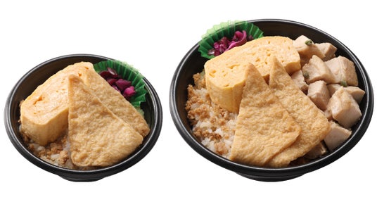 鶏そぼろご飯の上に自慢のふわふわだし巻きと、ふっくら甘く炊いたお揚げさんをのせた丼。