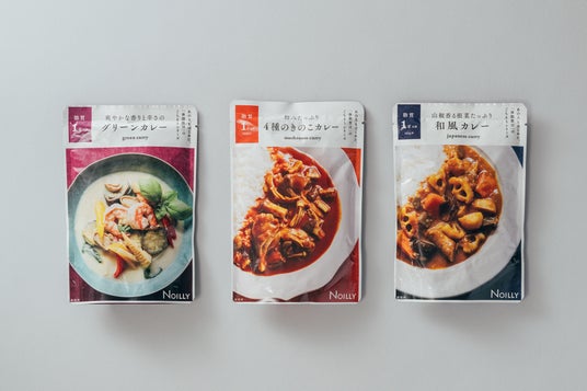 ▲「NOILLY」グリーンカレー、4種のきのこカレー、和風根菜カレー