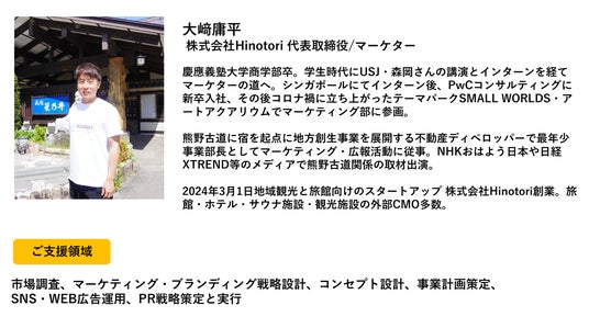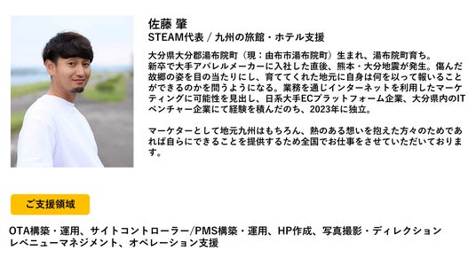 株式会社Hinotoriでは九州地方にてホテル・旅館向けのコンサルティングサービスを展開するSTEAM代表の佐藤肇氏を外部パートナーに迎え入れ、より強固な支援体制を構築しております。
