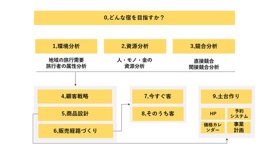 本プロジェクトでは「宿の目指す姿」を言語化しながら、1~9を網羅的にご支援いたします。また宿のオーナーやスタッフの方が「もう自分たちでできます!」と言っていただける自走型の組織に生まれ変わるための土台作りと知識移譲を目標にした3か月の伴走型支援をさせていただきます。