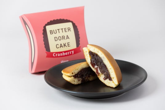 バターや餡に負けない風味を出すために特製の蜜に漬け込み、口当たりの良さと旨味を引き出しました。皮にも餡にもクランベリーを配合し、これぞクランベリーパンケーキと言えるようなバタどらケーキを目指しました。