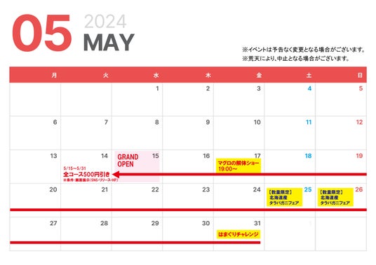 期間中は週末を中心に「マグロの解体ショー」や「貝すくい」など、友人やご家族とお楽しみいただけるイベントも開催予定です。