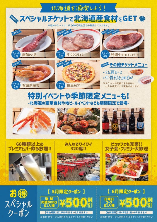 また、オープン記念イベントとして、こちらのプレスリリース・SNS広告・BBQビアガーデン北海道ホームページ、いずれかの画面をご提示いただいた方は、全コース500円引きに!5月末までの期間限定となっておりますので、この機会にぜひご利用ください。
