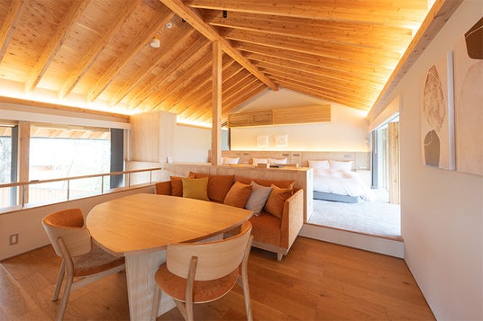 道産木材で建てられたスイート仕様の宿泊棟は、道産ブランドの旭川家具、北海道食材を愉しめる朝食と夕食、プライベートサウナ・水風呂・外気浴・ジェットバスを備えたバスルーム、良質な美容成分がふんだんに配合されたバスアメニティー「クロノシャルム」を全棟完備しており、お客様に五感で愉しんでいただけます。
