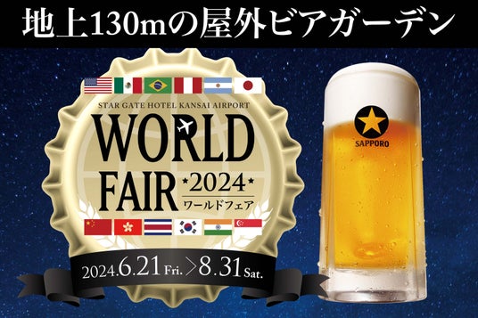 関西国際空港の対岸にある地上256mの超高層ランドマークタワー、スターゲイトホテル関西エアポート(所在地:大阪府泉佐野市りんくう往来北1番地)は、28階 ビアサロン「パティオ28」にて、2024年6月21日(金)から 8月31日(土)までの、金・土曜日限定のディナーで「ワールドフェア 2024」を開催いたします。海風が心地よい地上130mの屋外ビアガーデンで、世界の料理とビールが食べ放題&アルコールが飲み放題。6月と7月は、骨付き豚肉のバーベキューやシーフードのセビーチェなどのアメリカ・中南米料理、8月はタイ風春雨サラダやココナッツカレーなどのアジアの料理がメイン。天候不安定時は宴会場での開催に切り替え、安心してビアガーデンをお楽しみいただけます。
