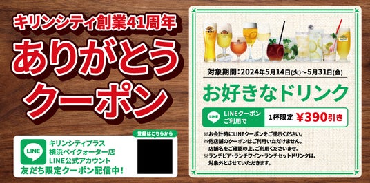 ビアレストラン キリンシティは、1983年5月14日に創業し、今年で創業41周年を迎えます。ご愛顧いただいているお客様への感謝の気持ちを込めて、お好きなドリンクが390円引き(1杯限定)になるクーポンを5月14日(火)に配信いたします。