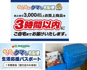 店内でお買上げいただいた商品を、3時間以内にご自宅へ配達 (有料) する「らくらくクマさん宅配便」がご利用いただけます。折りたたみコンテナ5個分まで配送可能です。