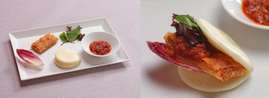 主役となる湯葉のはさみ揚げは、ザーサイ、アーモンド、揚げ玉ねぎ、シイタケ、ネギなどを湯葉で四層に重ね、揚げてあります。大豆を使ったスパイシーでピリ辛な魚香(ユイシャン)ソースと湯葉の食感をお楽しみください。
