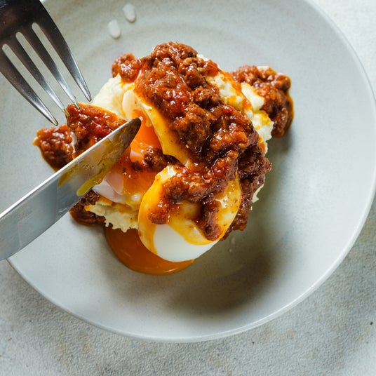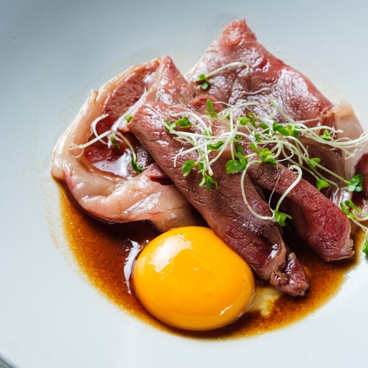 ワインと合わせることを考えてたどり着いたシンプルながら味わい深い一品になりました。半熟卵を崩してよく混ぜてお召し上がりください。