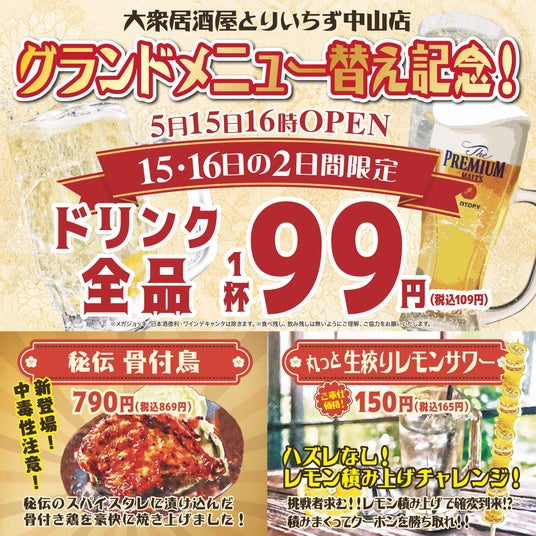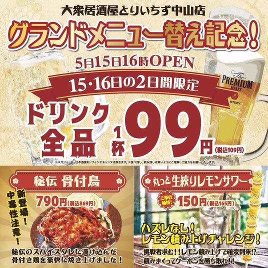 大事なことだから繰り返しお知らせ!リニューアルオープン&グランドメニュー替えを記念して5月15日(水)、16日(木)の2日間は、何杯飲んでもドリンク1杯99円(税込109円)!