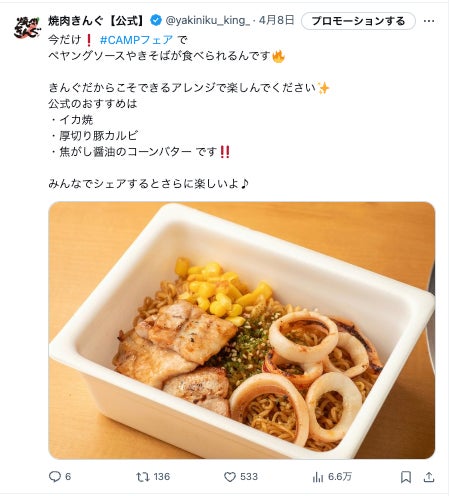 株式会社物語コーポレーション(本社:愛知県豊橋市/代表取締役社長:加藤 央之)が運営する『焼肉きんぐ』は、春期間限定「CAMPフェア」の「アレンジ自由 ペヤングソースやきそば」を、2024年5月13日(月)時点で5万食以上提供しました。