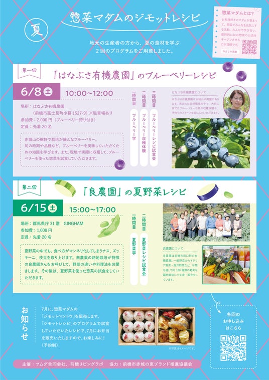 料理好きの市民が集まって、食材や料理を学びながらお惣菜店の開業を目指すプロジェクト「惣菜マダム」。昨年度の料理教室に続いて、今年度は地元で採れる旬の食材を学び、レシピを開発する「ジモットレシピ」を季節ごとに全4回開催します。第1回目の「夏」はナス、ズッキーニ、枝豆などの夏野菜とブルーベリーを取り上げて生産者さんから直接お話をお聞きするセミナーを開催。7月には、「ジモットレシピ」のプログラムで試食していただいたレシピでお弁当を販売いたします。(予約制)
