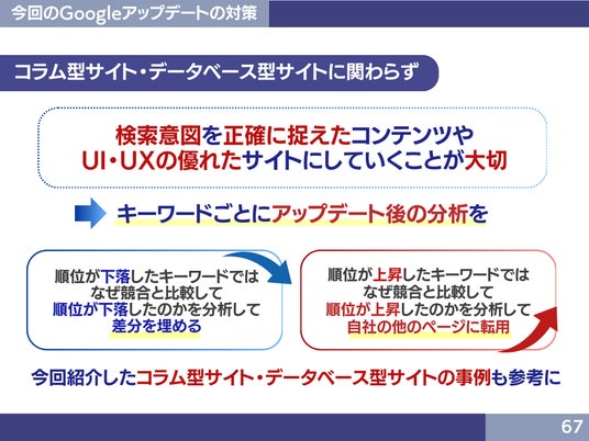 アップデート前後でトラフィックの変動があったサイトをそれぞれ比較して、差分の分析をした事例をコラム型サイト・データベース型サイト、それぞれで詳細に解説しています。本レポートを通じて、「ユーザーの検索意図を正確に捉えるようになっている」「UI・UX面でのSEO対策の重要性が増してきている」とは、具体的に何を指しているのか詳細に理解していただけます。