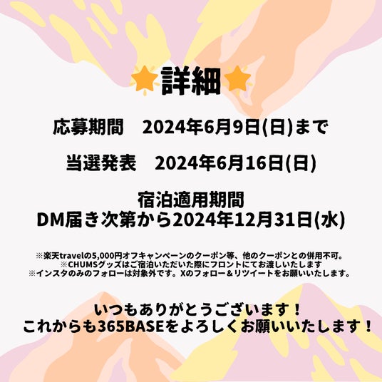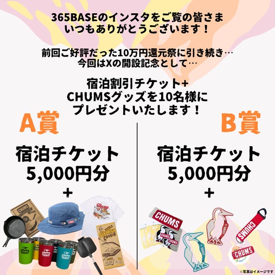 365BASEで使える5,000円割引チケット?#CHUMS グッズを10名様にプレゼント!??当選された方は宿泊時にフロントにて直接お渡し致します(ハート)応募方法