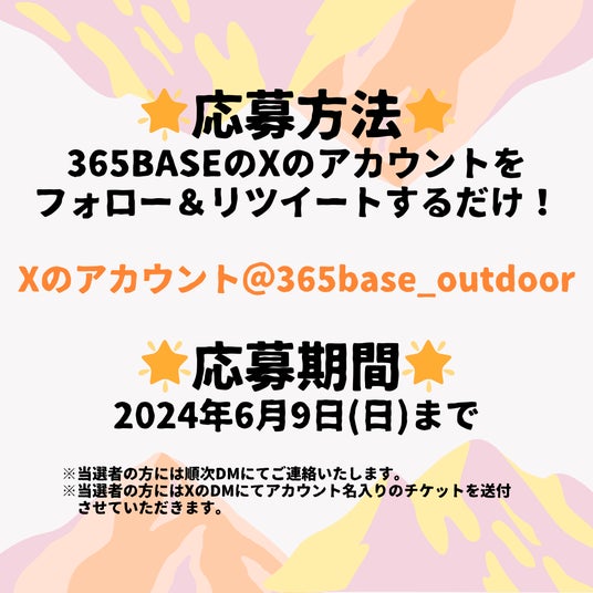 X(旧Twitter)にて、365BASEのアカウント"@365base_outdoor" を検索して頂き、フォロー&リツイートをするだけ!