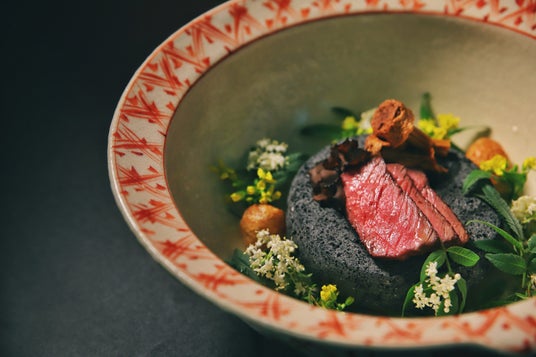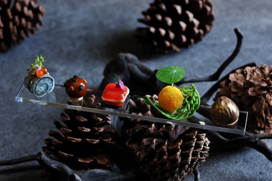 前菜の「五味」は、谷關エリアで大切にされてる五葉松(ごようまつ)からインスピレーションを受けた、松ぼっくりを使った器に、自然を表現する五つの味を盛り付けました。メインの肉料理は、2種のソースと本わさびを添えた牛ひれ肉のスモークソルト焼きで、庭に咲く花々の中にあるイメージで作られています。中華や和食、フレンチなどの国籍に捉われず、谷關の豊かな自然と融合するような9皿の料理は、自然と「共に舞う」ような感謝に満ちた時間を提供します。