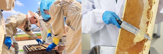画像左:養蜂プロジェクトメンバーによる内検の様子 右:遠心分離機にかける前に、蜜刀(みっとう)で巣脾面の蜜蓋を切除している様子