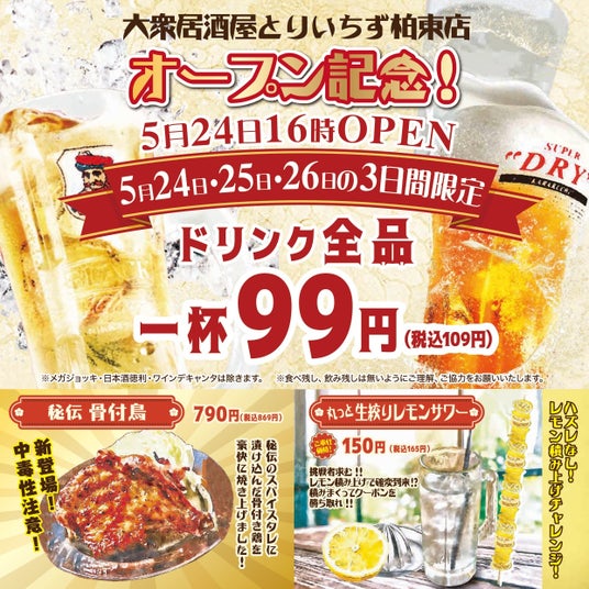 24年5月24日(金)16時『大衆居酒屋 とりいちず 柏東口店』が柏駅東口近くに新規オープン。オープンを記念して、2つの限定イベントを開催!