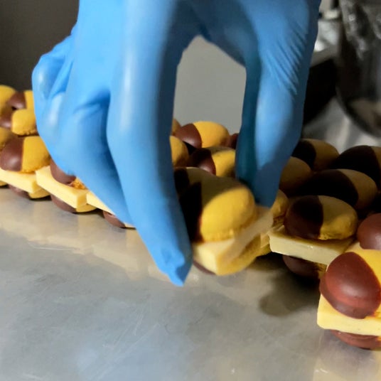 最高級のチョコに仕上げるために、延べ5日間かけて、3種類のカカオ豆を焙炒し、テンパリング温度やマカロン生地となるアーモンドのミキサー温度、アーモンドの油抜き時間も、1℃や1秒単位までの精度を徹底している商品です。