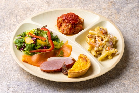 魚介の冷製チリソースマリネ/マカロニベーコンサラダ ブラックペッパー風味/彩りサラダ/スモークサーモン/合鴨の燻製/コーンとオニオンのキッシュ【温製プレート】