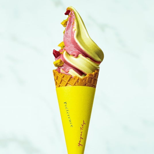 <プレファレンス>×<ヤヨイ東京>マリアージュ 701円昨年6月に東京・新中野にオープンしたパティスリー・ブーランジェリー<プレファレンス>と同年7月に東京・三軒茶屋にオープンしたジェラート店<ヤヨイ東京>がコラボ。<ヤヨイ東京>のスペシャリテである3種のピスタチオをバランスよくブレンドした「ピスタチオ」と、フランボワーズ、さくらんぼなど5種の赤いフルーツにライチを加えた<プレファレンス>スペシャリテのケーキをイメージして作った「フリュイルージュ」をミックスソフトクリームで表現。2店舗の代表的なフレーバーを優美に華やかにマリアージュしました。