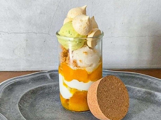 パティシエの久原春香氏は製菓専門学校を卒業後、渡仏。<PONTE DEL PIATTO>でデセールを担当するなどの経験を積み、2023年6月に東京・吉祥寺に<シモンヌ>をオープン。お店では夜のワインバーで提供しているパフェを初夏のトロピカルフルーツを使って気軽な瓶で食べられるようアレンジした伊勢丹新宿店限定のパフェが登場。