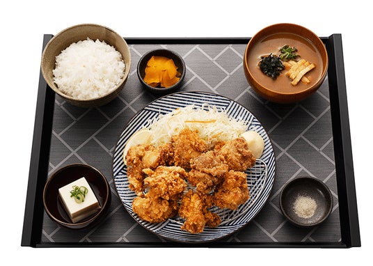 ※定食屋宮本むなし、各店舗内で「鶏もも肉の唐揚げ定食(8個)(950円税込み)」1人前をお召し上がりいただけます。