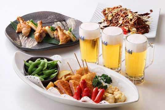 〈食べ放題〉枝豆/冷奴/サラダ/海老カクテル/肉じゃが/豚しゃぶとナムルの和え物/蒸し鶏のチリマヨソース/スモークサーモンとお魚ソーセージのサラダ/骨付きチキンの焼き鳥風/ハムカツ/ピザトースト/焼きそば/焼きめし/コロッケ/