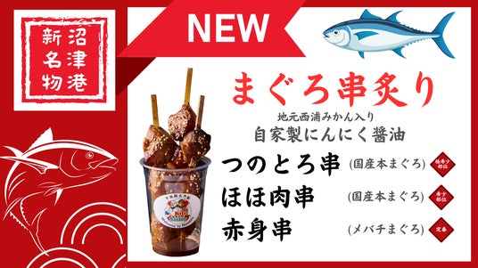 沼津市場仲買人と千鳥観光汽船料理長秋山ががタッグを組んで厳選している「まぐろ」を地元西浦みかん入りの自家製にんにく醤油につけて炙った【まぐろ串】