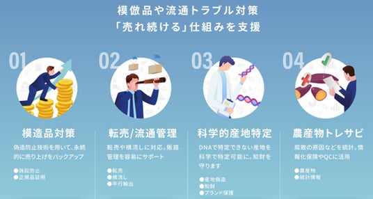 模造品対策を専門に行うシステム会社。 日本産の価値を未来に残すため、バイオ技術やAI(IT)を活用した先進的なシステム開発力で、転売・横流し・偽物対策のためのシステム、トレーサビリティの仕組み構築などを展開。日本青果物輸出促進協議会におけるブランディング・マーケティングの流通支援、輸出時の農作ものの腐敗などのトラブルに備える、農林水産省の補助事業における大規模かんしょ事業などの実績がある。