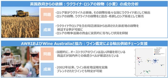 「産地の証印(TM)」は日本に先んじて、海外で多くの実績があります。そのひとつが、穀物をめぐるウクライナ-ロシア間の問題です。ロシア軍によるウクライナ占領の際、ロシア軍がウクライナの穀物を占有し、多くの国々に輸出していることが明らかになりました。それだけではなく、本来はウクライナ産である穀物をロシア産の穀物と混合したり嵩増ししたりして、ロシア産として販売され、その利益が戦争の資金源になっていることが証明されたのです。他にも、コーヒーやワイン、アワビ、肉類など、あらゆる食品や加工品での実績がございます。