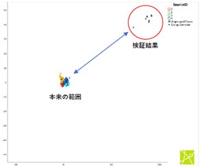 検証結果は本来の範囲から離れた場所にプロットされており、偽物であることがわかる海外では、日本産ブランドの種子や苗を海外で栽培し、「日本産」と偽装して流通させるという事例が横行しています。DNA解析を行っても偽装品であることは証明できず、日本産ブランドの価格や価値が下がることが懸念されてきました。また、近年は高額な日本酒の空き瓶がインターネットで販売され、中身だけ入れ替えられて、海外で取引されるというケースも増えています。
