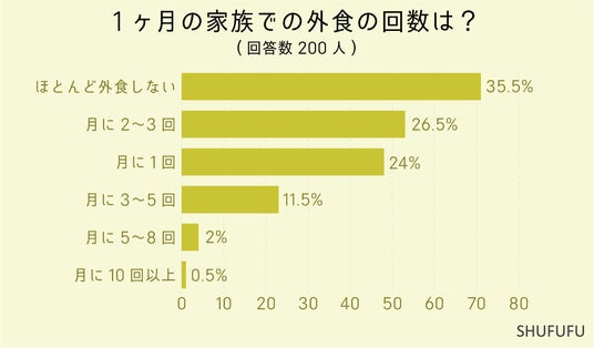 1ヶ月の家族での外食の回数を尋ねたところ、1位は「ほとんど外食しない(35.5%)」、2位「月に2~3回(26.5%)」となりました。外食はせずに自炊をしているという方が最多になりました。最近は物価高もありますし、外食費は家計を圧迫しやすいのかもしれませんね。