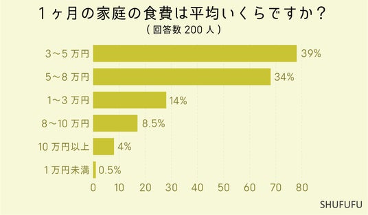 1ヶ月の家庭の食費は平均いくらかに関しては1位「3~5万円(39%)」、2位「5~8万円(34%)」でした。