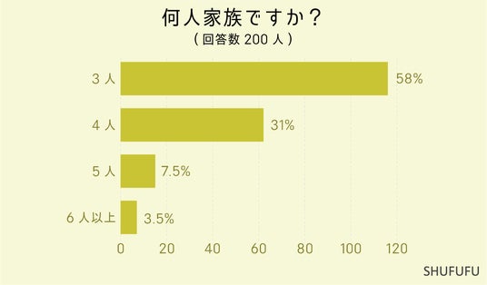 何人家族ですか?の問いに対して最も多かったのが「3人(58.%)」でした。 次いで「4人(31%)」「5人(7.5%)」という結果でした。