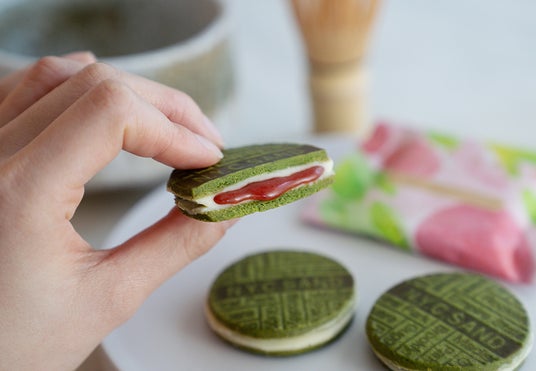 苺の果汁とパウダーを混ぜ合わせ艶やかな赤色に炊き上げた苺キャラメルは、力強いキャラメルのコクを感じながらも苺の甘酸っぱいフレッシュ感を残した仕上がりに。宇治抹茶特有の苦みと甘みを感じるバタークッキーとの相性は、対照的ながらバランスの取れた味わいに。