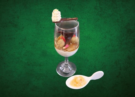 ココナッツプリンに和紅茶のソースが絶妙にマッチ。トッピングされている、さつまいも・ぎゅうひ・グリーンピース・大納言かのこを絡めて一緒にお召し上がりください。