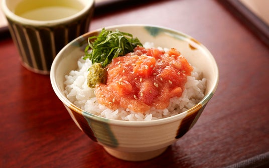 [サーモン明太子のだし茶漬け]ごはんに乗せて、だしをかけるだけ。くせになる一品。